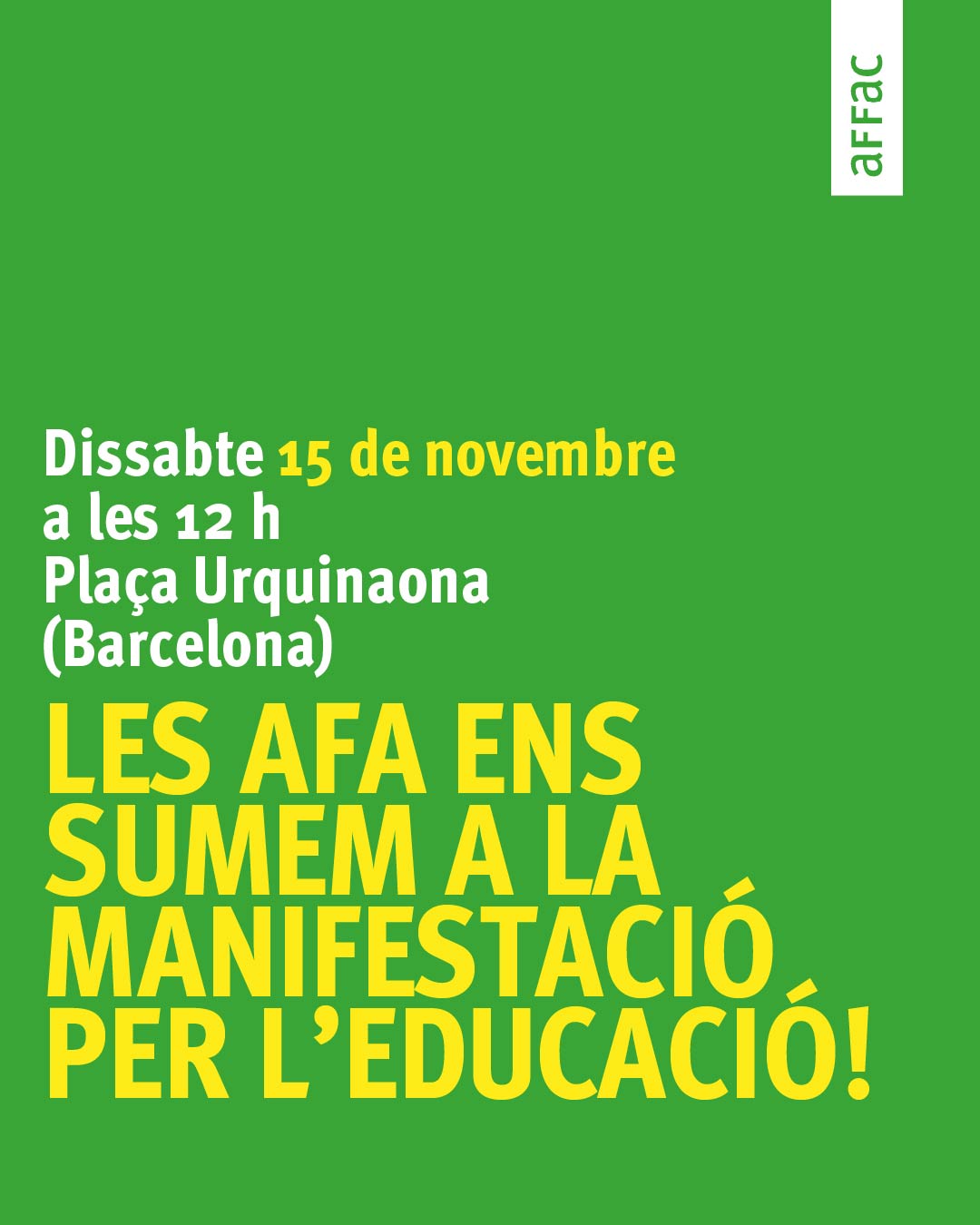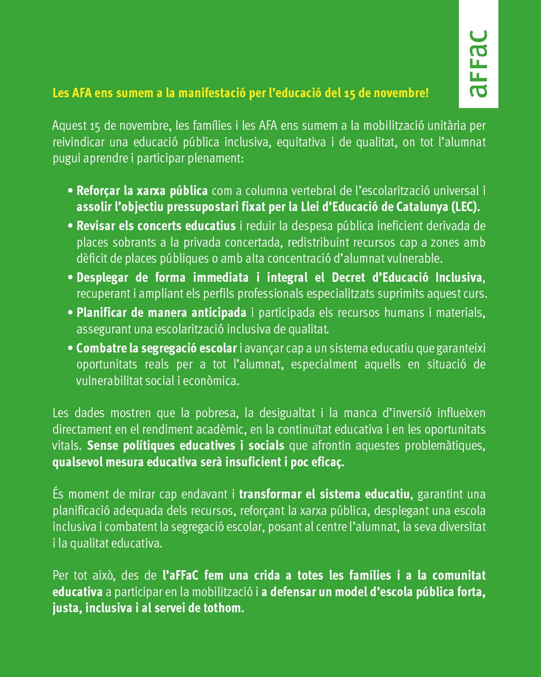 Aquest 15 de novembre, les famílies i les AFA ens sumem a la mobilització unitària per reivindicar una educació pública inclusiva, equitativa i de qualitat, on tot l’alumnat pugui aprendre i participar plenament: